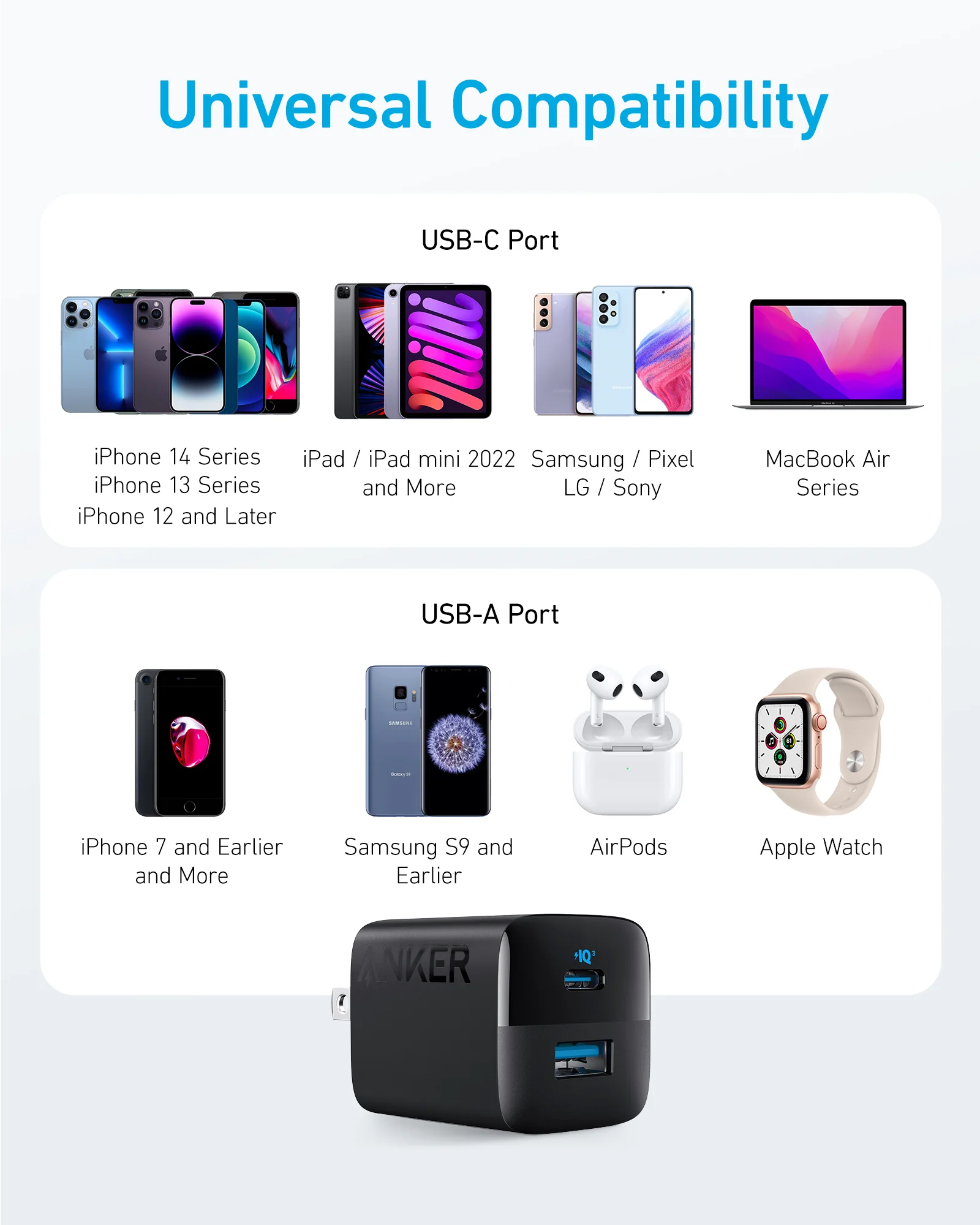The Anker 323 Charger (33W) is a compact dual-port wall charger that delivers fast USB-C Power Delivery charging up to 33W, allowing you to quickly power smartphones, tablets, and other devices. It features both USB-C and USB-A ports for charging two devices at once, along with a portable design and built-in safety system for reliable everyday use.
