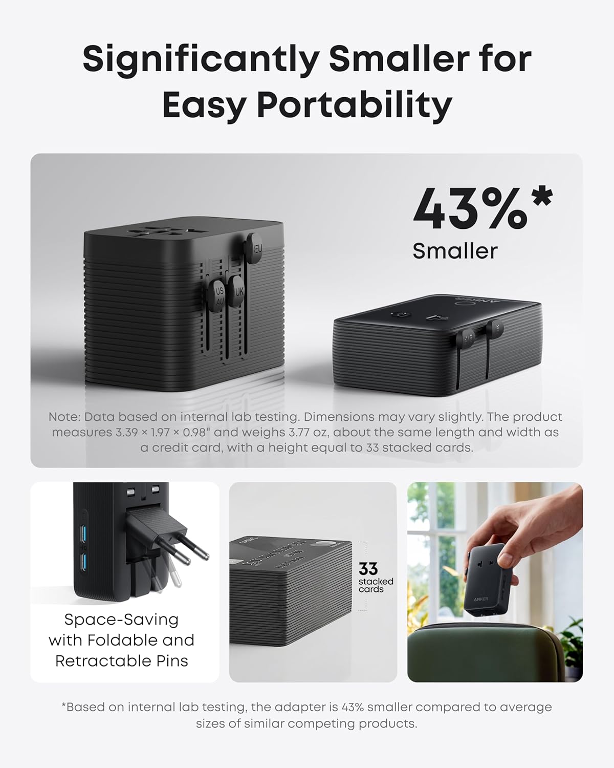 (Note: This travel adapter supports a maximum of 6A. ) - Exceptionally Compact: Enjoy more packing space with a design that is 43% smaller than similar models. Includes foldable and retractable pins for enhanced portability.