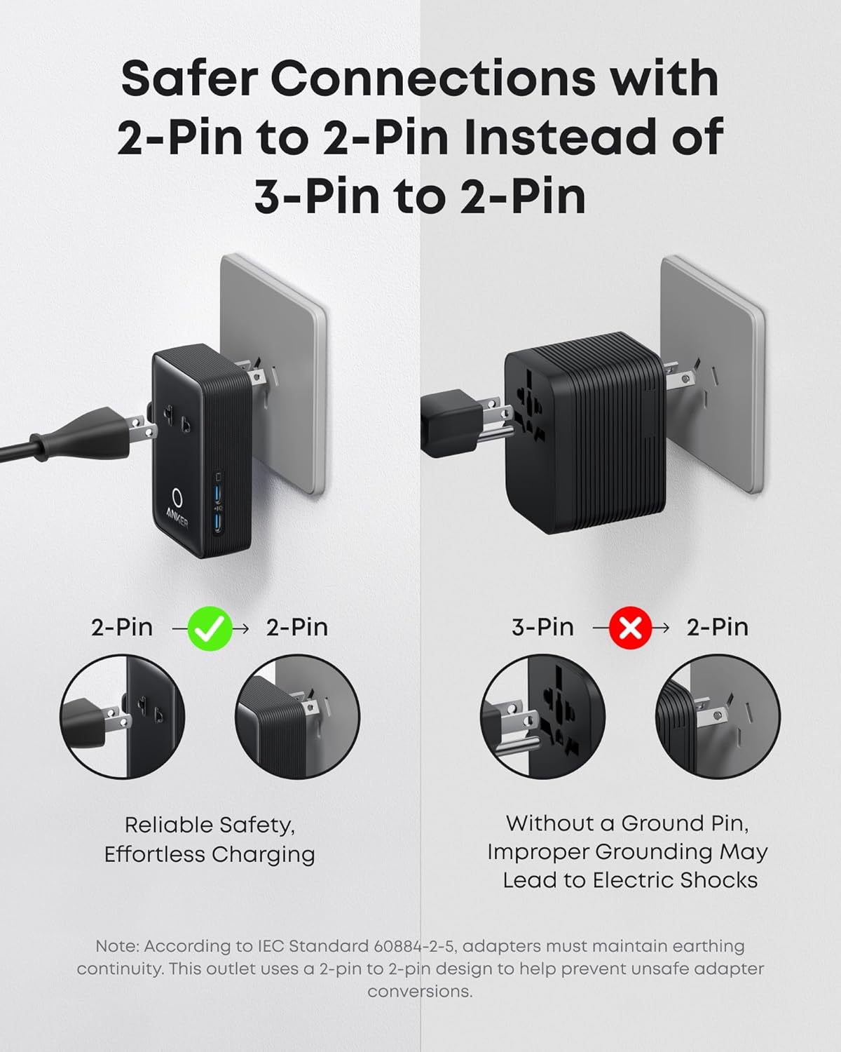 - 2-Pin to 2-Pin Connection: Experience peace of mind with a safe 2-pin to 2-pin setup designed to prevent electric shocks and ensure your travels are worry-free.