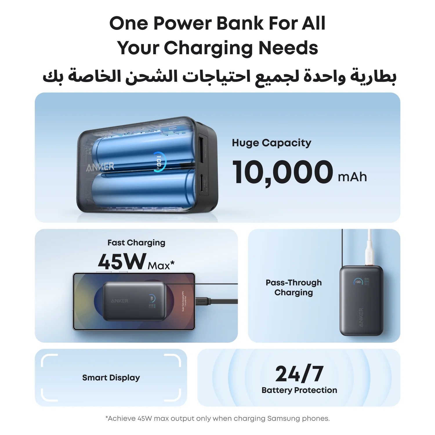 - Your Go-To Power Solution: Equipped with a huge 10,000mAh capacity, fast 45W max charging, pass-through technology, an intelligent display, and 24/7 battery protection for safe, efficient power anytime. The USB-C cable / port is compatible with Samsung Fast Charging 2.0.