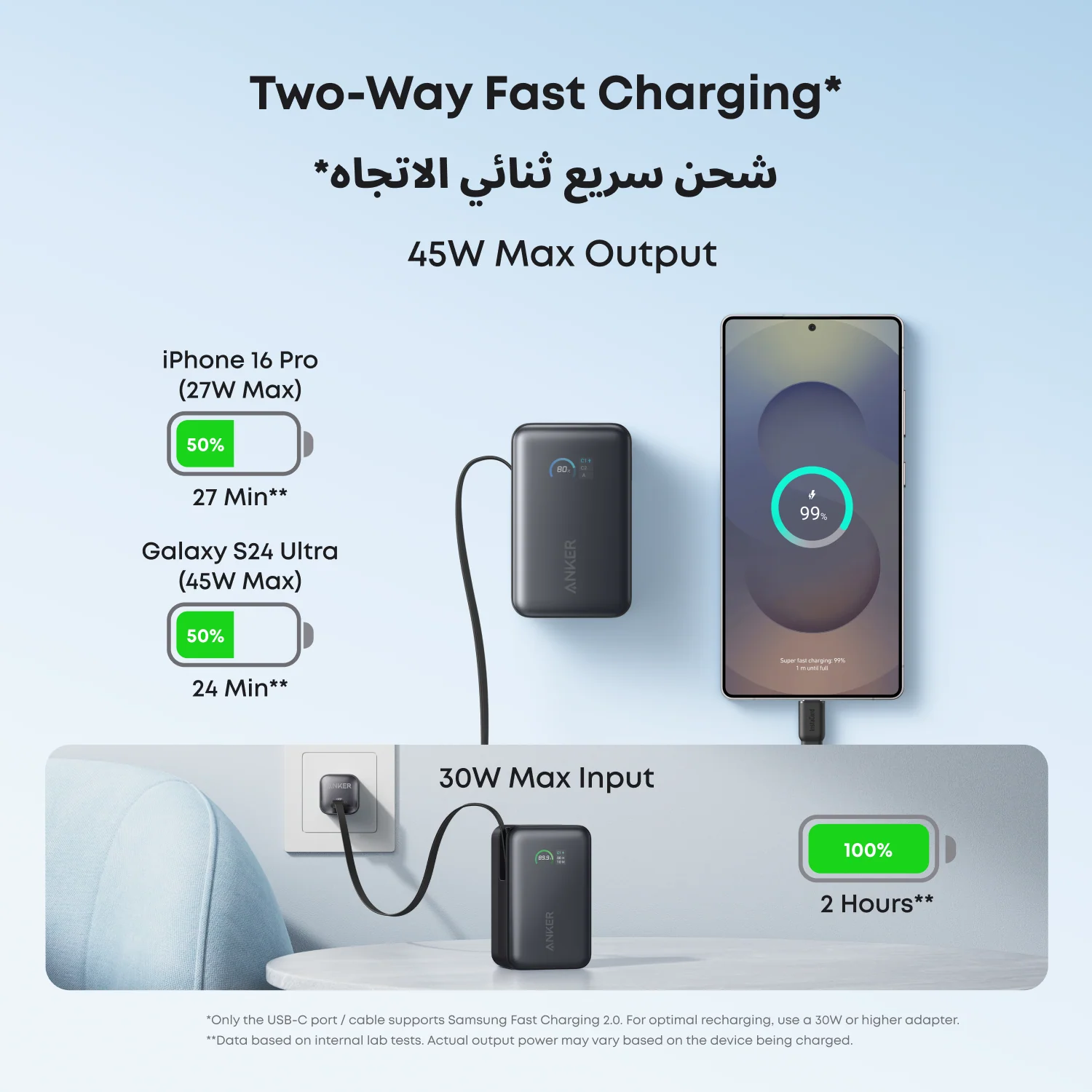 - Two-Way Fast Charging: Enjoy simultaneous charging and recharging with a 45W max single-port USB-C output for devices and a 30W max input for quick power bank replenishment. Charge an iPhone 16 Pro to 50% in 27 minutes and recharge the power bank to 100% in 2 hours.