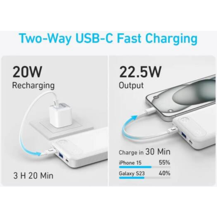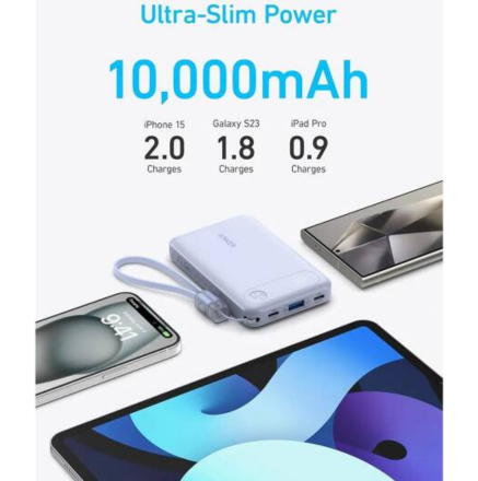 The Anker PowerCore 10000mAh 22.5W Portable Charger is a compact and lightweight power bank designed for fast, reliable charging on the go. With advanced Power Delivery (PD) technology and a slim design, it easily fits into your pocket or bag while delivering enough power to recharge smartphones multiple times. It also includes a USB-C to USB-C cable and a convenient lanyard-style design for added portability.