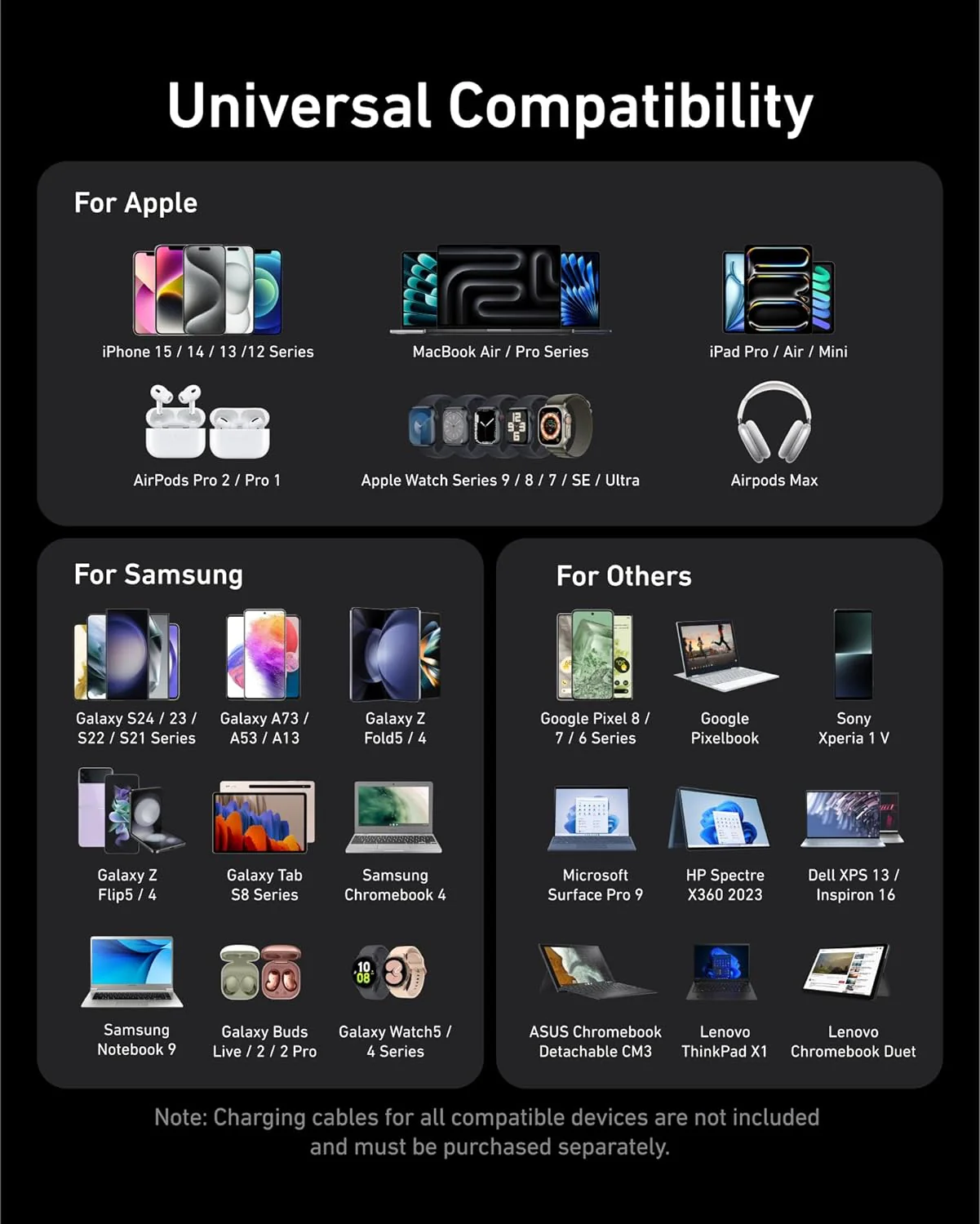 Compatible Phone Models: iPhone 16/15/14 Series /MacBook Air / Pro Series /iPad Pro / Air / Mini AirPods Pro 2 /AirPods Pro / Apple Watch Series/Galaxy S24 / 23 / S22 / S21 Series /Galaxy A73 / A53 / A13/ Galaxy Z Flip5 / 4 Galaxy Z Fold5 / 4/ Galaxy Tab S8 Series /Samsung Chromebook 4 /Samsung Notebook 9 /Galaxy Buds Live / 2 / 2 Pro/Google Pixel 8/Series Google Pixelbook/Sony Xperia 1 V/Microsoft Surface Pro 9 /HP/Spectre X360 2023/Dell XPS 13 /Dell Inspiron 16/ASUS Chromebook Detachable CM3/Lenovo ThinkPad X1 Lenovo/Chromebook Duet