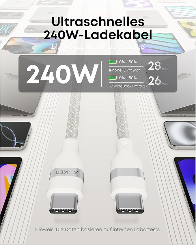 - Super-Fast 240W Cable:Â This 240W USB-IF certified cable can charge your 16-inch MacBook Pro (2023) to 50% in just 28 minutes or your iPhone 15 Pro to 50% in 26 minutes.