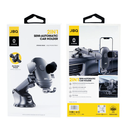 The JBQ 2-in-1 Semi-Automatic Car Holder is the perfect accessory for safe and convenient smartphone use while driving. With its strong gripping mechanism, it securely holds your phone, preventing slips and drops during sudden stops or turns. The air outlet chuck and adjustable suction base offer versatile mounting options for your car dashboard or air vent, ensuring an optimal viewing angle. Its sleek and durable design combines functionality with style, making it a must-have for every driver.