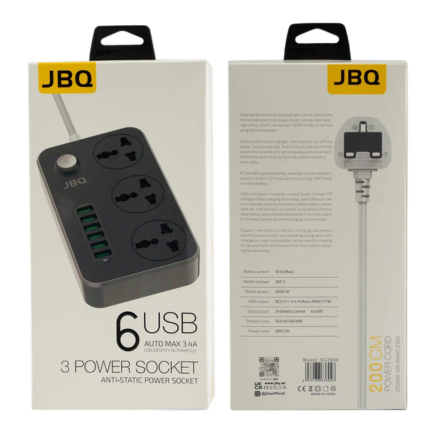 The JBQ 3-Power Socket with 6 USB Ports is a versatile and reliable power extension ideal for modern households and offices. Featuring 3 universal sockets and 6 USB ports (Auto Max 3.4A), this power strip is perfect for powering multiple devices simultaneously. Its anti-static technology and overload protection provide enhanced safety, making it suitable for daily use.
