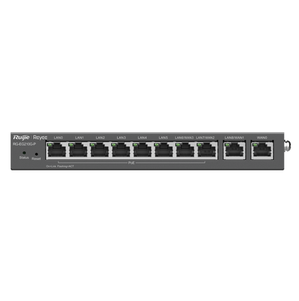 With 8 PoE+ ports, multi-WAN load balancing, high throughput (600 Mbps), and Ruijie Cloud remote management, the RG-EG210G-P provides reliable connectivity, simplified configuration, and enterprise-grade security for growing networks. It also includes an integrated network controller capable of managing large-scale access point and switch deployments from a single platform.