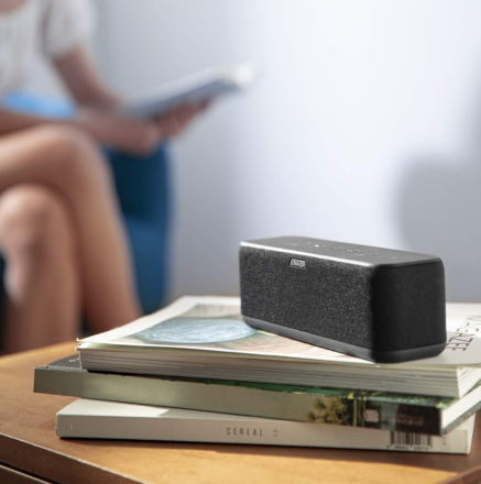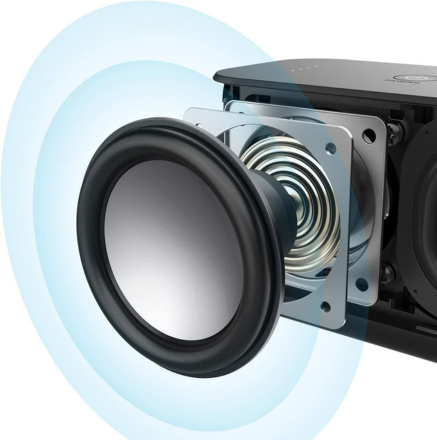 Equipped with dual high-performance drivers and passive subwoofers, the speaker produces clear highs, detailed mids, and deep bass for a room-filling sound experience.